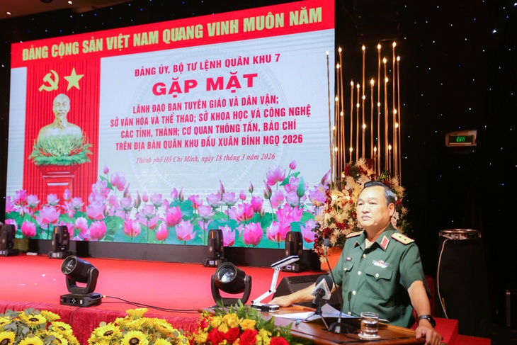 Trung tướng Trần Vinh Ngọc, Bí thư Đảng ủy, Chính ủy Quân khu 7, chia sẻ tại buổi gặp mặt - Ảnh: KIÊN CƯỜNG