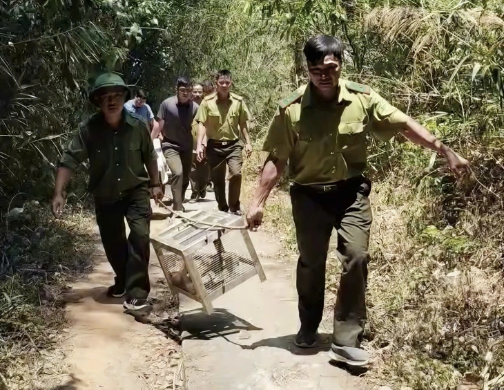 Rắn hổ mang chúa được lực lượng kiểm lâm thả về rừng tự nhiên - Ảnh: HOÀNG MINH