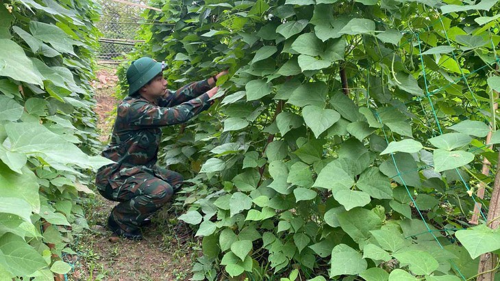 Những khoảnh đất dành trồng rau, nuôi gà, bò, dê, heo... được bộ đội quy hoạch tươm tất, ngay hàng thẳng lối. Gần Tết, chiến sĩ tập trung ở vườn nhiều hơn để chăm sóc, ban đêm thì đi rọi đèn bắt sâu để cây khỏe mạnh, cung cấp đủ nhu cầu đơn vị và có nguồn bán ra bên ngoài.