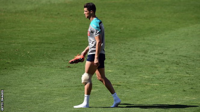 Ronaldo phải rời sân với cái đầu gối trái đeo túi nước đá. Ảnh: BBC |