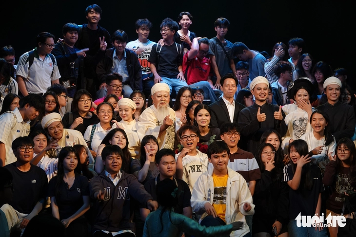 Học sinh Trường THPT Hùng Vương chụp ảnh cùng các nghệ sĩ sau vở Yêu là thoát tội - Ảnh: LINH ĐOAN