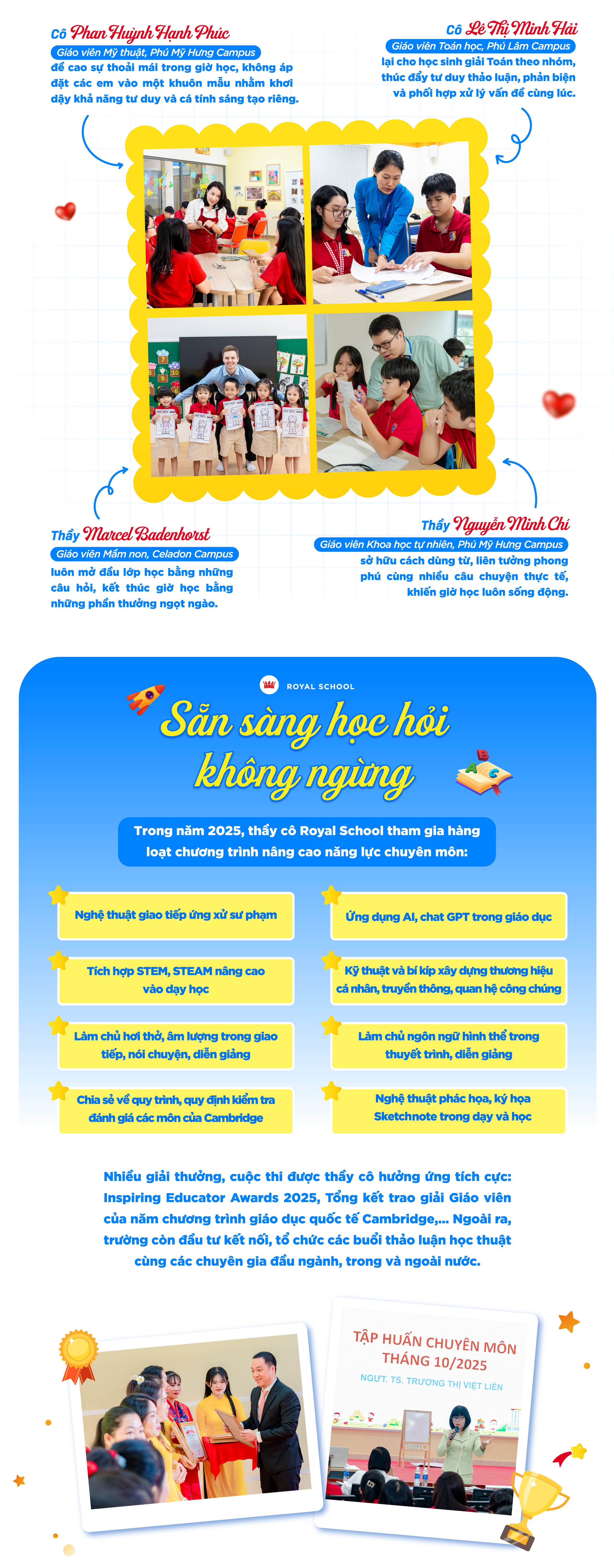 Tin rằng, với bản lĩnh của người thầy truyền cảm hứng và một trái tim yêu thương nhiệt thành, thầy cô sẽ đóng góp nhiều hơn nữa vào công cuộc kiến tạo môi trường học tập thân thiện - tích cực - chuẩn quốc tế, giúp học sinh phát triển toàn diện từ năng lực học đến trí tuệ cảm xúc, từ tư duy phản biện đến khả năng kết nối và hội nhập, tỏa sáng với vị thế là công dân toàn cầu tài năng.