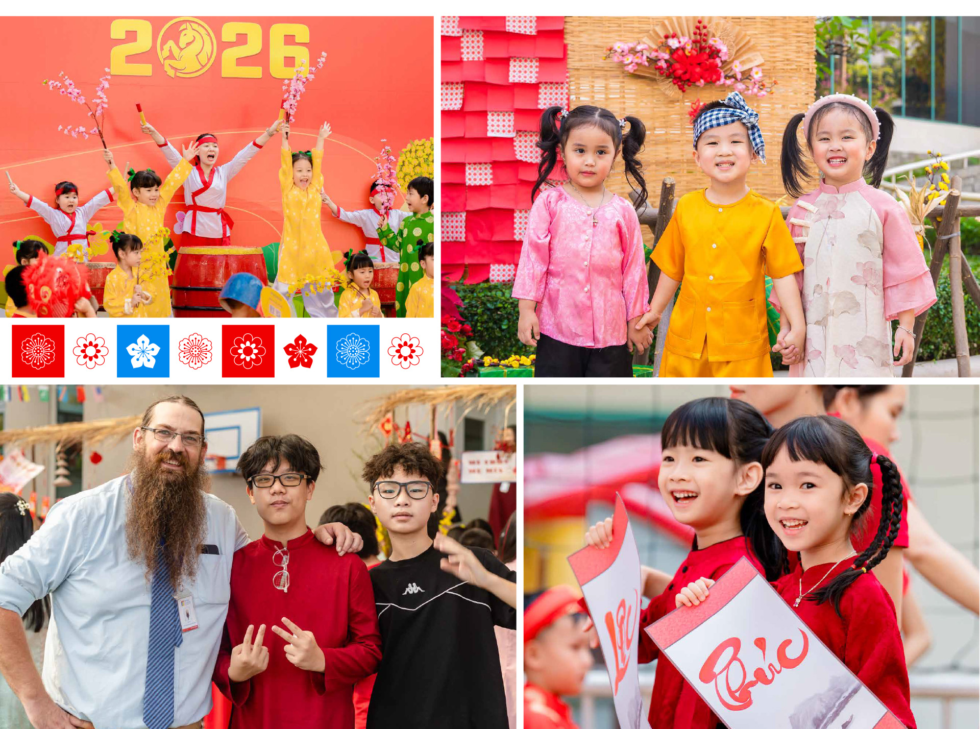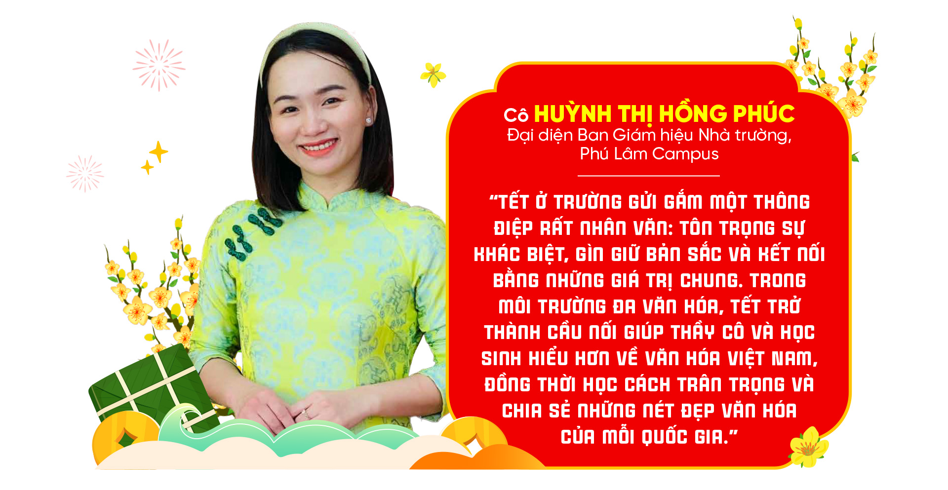 Tết trong mỗi thành viên đều mang một dấu ấn riêng, gắn liền với những kỷ niệm đặc biệt. Dù vậy, những câu chuyện vẫn ẩn chứa một tình cảm chung nhất - tình yêu dành cho nét đẹp văn hóa, cho cội nguồn, cho những giá trị truyền thống tốt đẹp của con người Việt Nam. Và trường đã tạo nên sân chơi gắn kết với loạt chương trình, hoạt động chào đón ý nghĩa, giúp thầy cô, học sinh, phụ huynh thể hiện và lan tỏa tình yêu ấy.