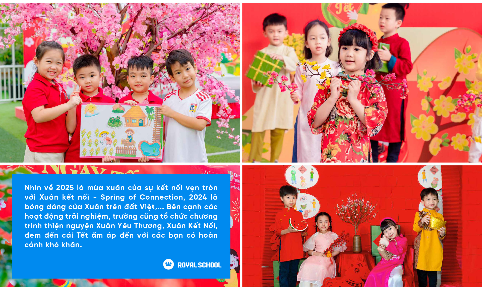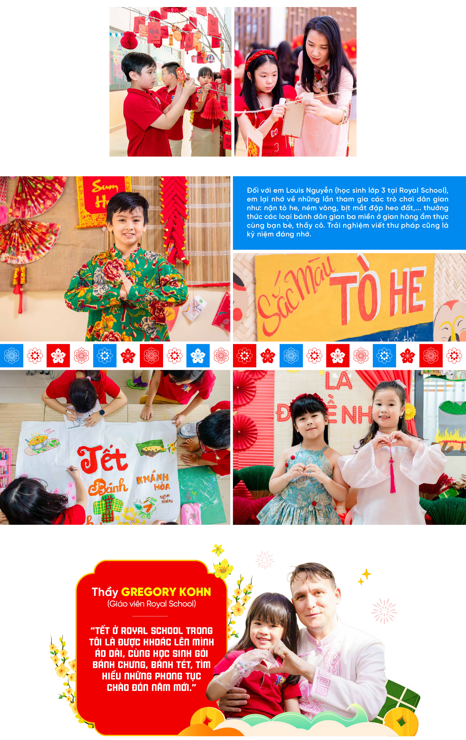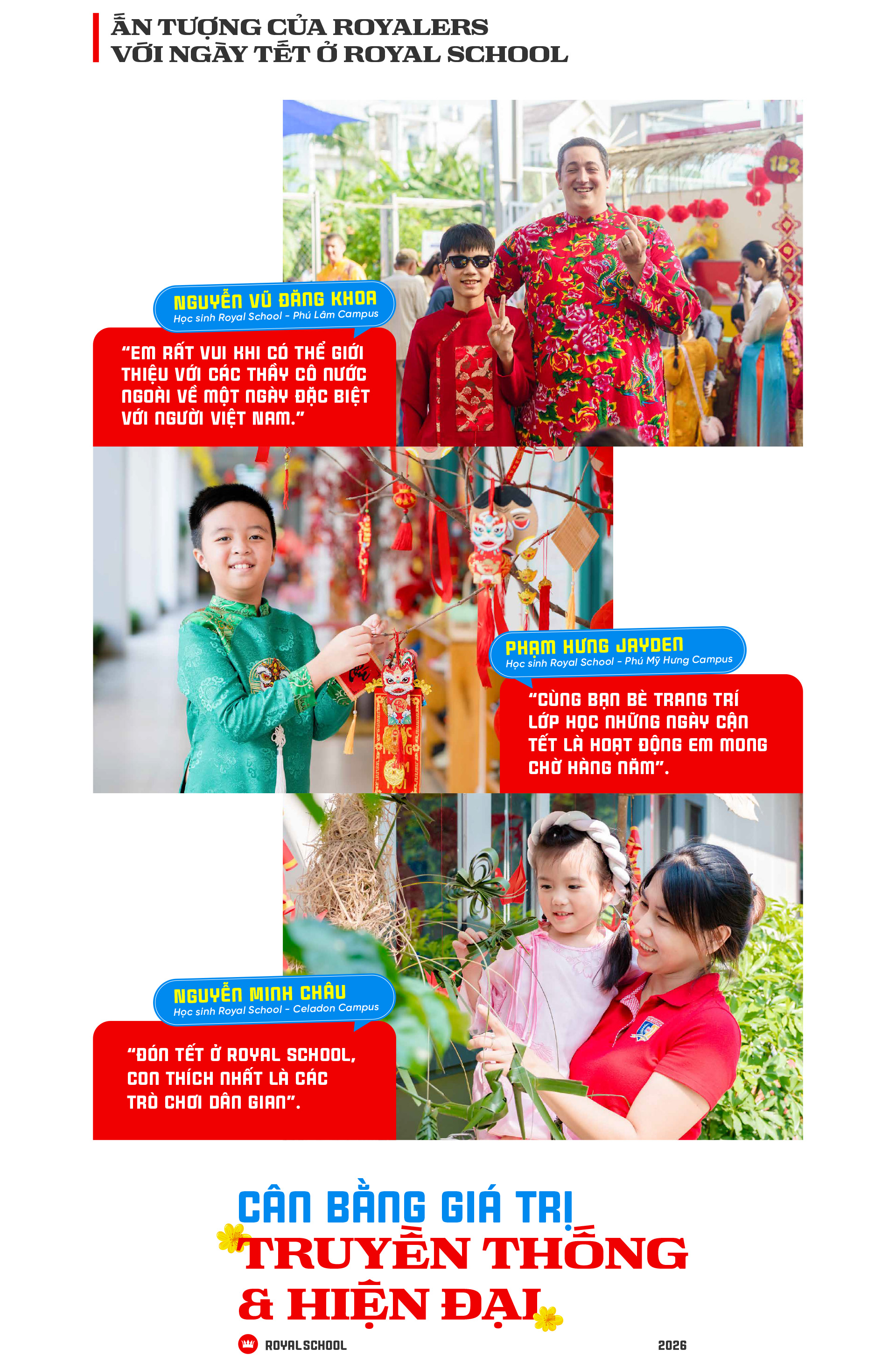 Royal School thành công xây dựng chương trình Tết với nhiều chủ đề đa dạng qua các năm: 2026 gợi nhớ vị của Tết với Taste of Home, với âm thanh rộn ràng của Xuân toàn cầu - Global Spring. Ở khối mầm non, là bóng dáng của Ngày Tết Việt Nam, kết nối các thế hệ cùng ôn lại ký ức đẹp đẽ cùng ngày hội truyền thống.