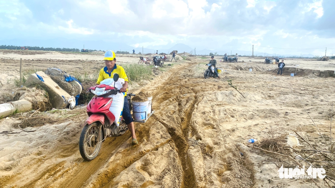 Thay vì xuống giống vụ mới, nhiều người dân lặng lẽ mang bao, xẻng ra đồng… xúc cát chở về nhà - Ảnh: TRƯỜNG TRUNG
