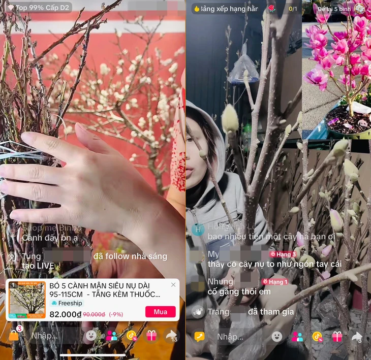 Tương tự, shop Chung Tứ Xuyên livestream bó 30 cành mận cao 80-90cm. Riêng loại bó 10 cành là 129.000 đồng. Chủ shop cho biết khách mua về chỉ cần cắm là hoa sẽ nở bung, không cần dưỡng. "Hoa mận tốt về độ bền, có cả lá, nụ, lộc. Bên em còn có bạch đào Tây Bắc với hoa cánh kép nở trắng, thơm nhẹ 220.000 đồng", chủ shop nói thêm.