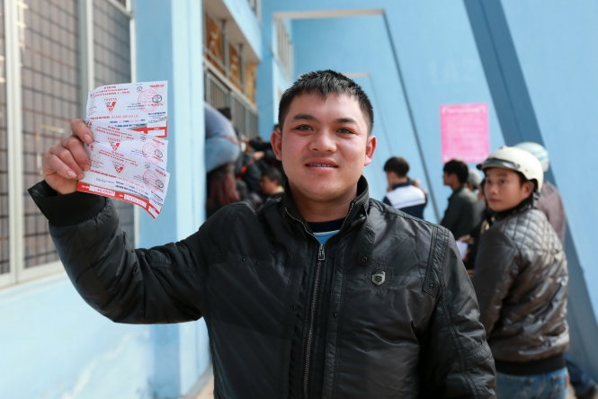 | Một CĐV vui mừng sau khi mua được vé. Ảnh: Nam Khánh |
