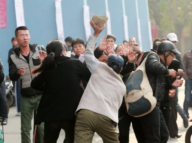 | Dùng cả gạch tấn công nhau. Ảnh: Nam Khánh |