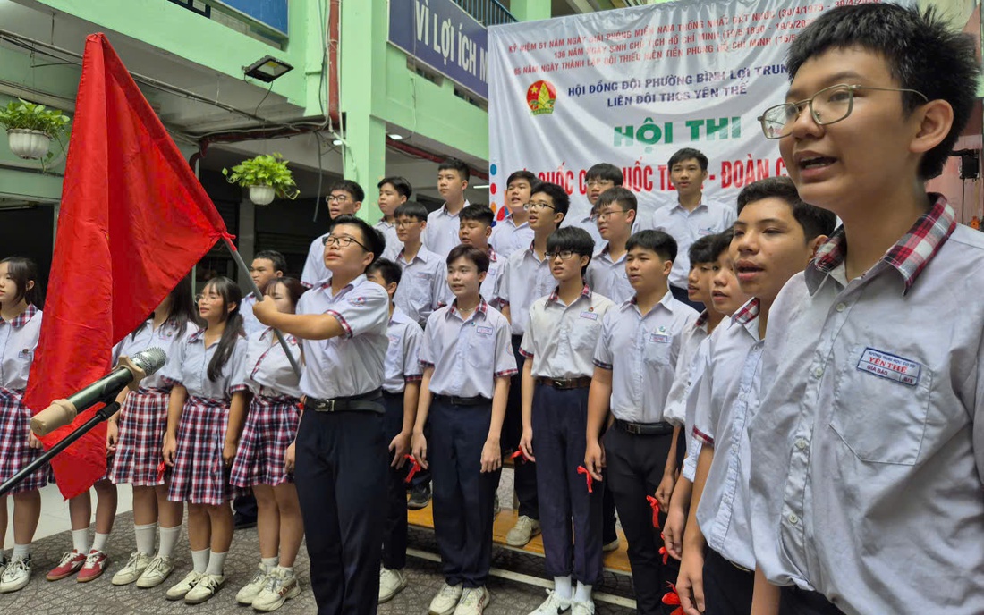 Học sinh lớp 9/1 Trường THCS Yên Thế, phường Bình Lợi Trung, TP.HCM với phần thi hát Quốc ca rất ấn tượng - Ảnh: H.H