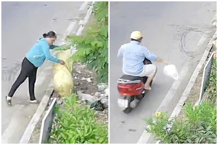 Camera an ninh trên tuyến đường Nguyễn Văn Linh (ấp 36, xã Bình Chánh) ghi lại hình ảnh hai người vứt rác không đúng nơi quy định. Công an xã Bình Chánh sau đó đã mời hai người trên về trụ sở làm việc - Ảnh cắt từ clip do camera ghi lại