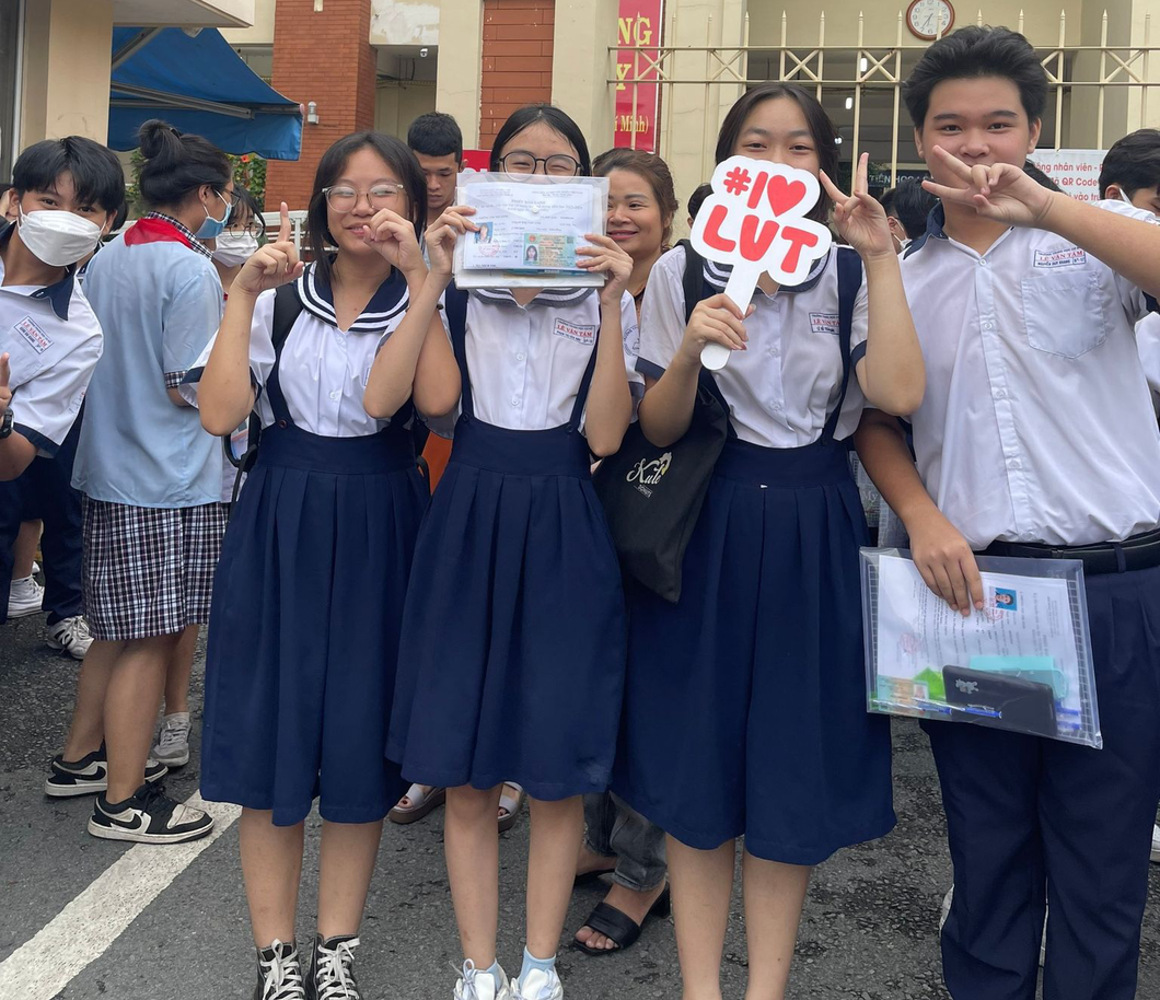 Học sinh Trường THCS Lê Văn Tám, quận Bình Thạnh rất vui khi được các thầy cô của mình đón và động viên trước khi vào phòng thi - Ảnh: LIÊN CHI