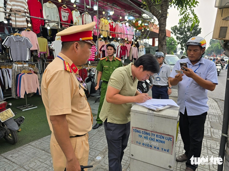 Cán bộ Phòng Kinh tế, Hạ tầng và Đô thị phường Thông Tây Hội (áo trắng) phối hợp Đội cảnh sát giao thông Hàng Xanh và Công an phường Thông Tây Hội lập biên bản làm việc, sẽ mời chủ shop quần áo lên xử lý hành vi lấn chiếm vỉa hè để buôn bán - Ảnh: MINH HÒA