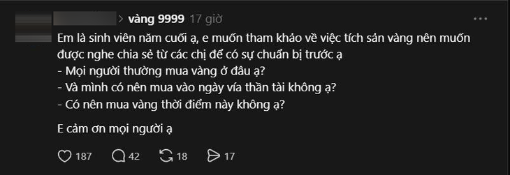 Đó là câu hỏi của bạn sinh viên năm cuối chia sẻ trên mạng xã hội Thread, đã thu hút nhiều ý kiến chia sẻ xoay quanh việc tích sản bằng vàng và băn khoăn có nên mua vào ngày vía Thần Tài hay không.