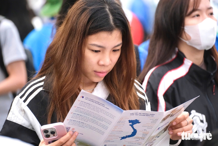 Sinh viên tìm hiểu vị trí việc làm tại Ngày hội việc làm - HAU Job Fair 2026 - Ảnh: NGUYÊN BẢO