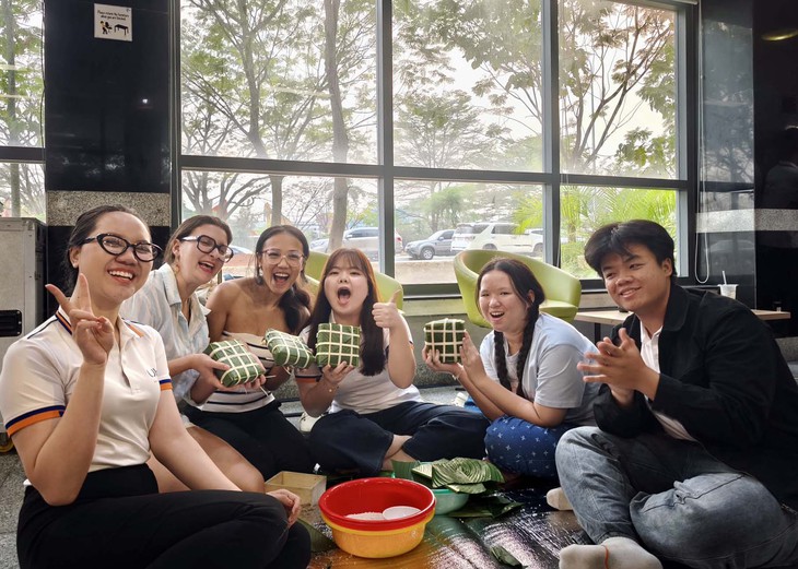 Các sinh viên Pháp đang theo học chương trình thạc sĩ luật tại Viện Quốc tế UEL, Trường đại học Kinh tế - Luật (Đại học Quốc gia TP.HCM), không giấu được sự hào hứng khi tự tay gói chiếc bánh chưng truyền thống.