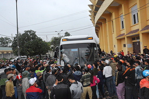 | Người hâm mộ vây xe chở đội HAGL đến tập ở sân Vinh - Ảnh: H.Văn |