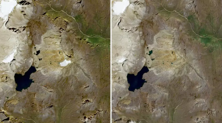 Ảnh vệ tinh cho thấy sông băng Cerros de la Plaza (trái) có một ít tuyết phủ vào ngày 28-12-2015 và không có tuyết vào ngày 28-2-2026 - Ảnh: AFP