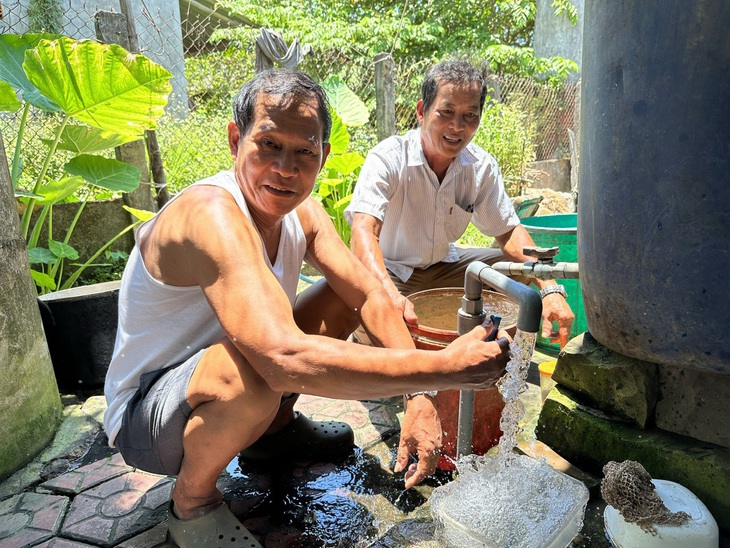 Ông Bảnh (phải) cùng người dân nở nụ cười hạnh phúc khi nước sinh hoạt ổn định từ lúc ông tiếp nhận và “hồi sinh” hai công trình cấp nước sinh hoạt “đắp chiếu” - Ảnh: TRẦN MAI