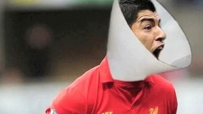 | "Người điên" Suarez phải đeo một cái chụp quanh cổ để ngăn cản anh cắn người và tự cắn mình. Ảnh: Daily Mail |