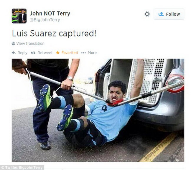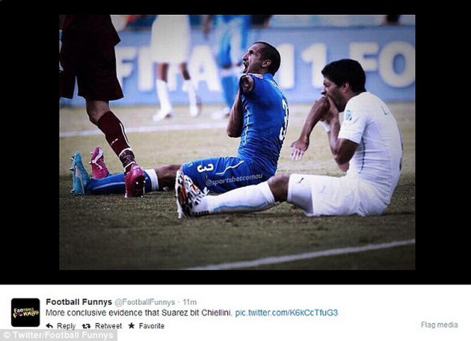 | "Kẻ ăn thịt người" Suarez đang gặm cánh tay của Chiellini. Ảnh: Daily Mail |