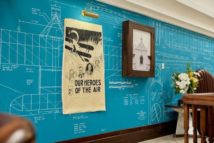 Các mảng tường phủ kín những phác thảo kỹ thuật máy bay, động cơ bằng nét phấn. Những bức họa nghệ thuật được Bill Bensley đích thân tuyển chọn, khắc họa hình ảnh những phi công thời kỳ đầu trong trang phục mũ da, kính bảo hộ và áo khoác măng tô.