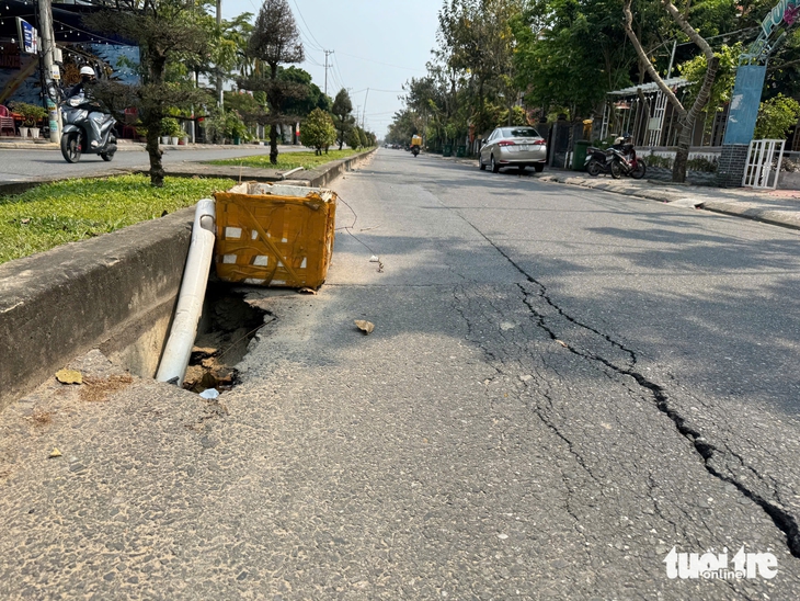 Mặt đường Lê Hồng Phong, phường Hội An Tây, nơi có tuyến kênh ngầm đi qua bị sụt lún nghiêm trọng - Ảnh: LÊ TRUNG