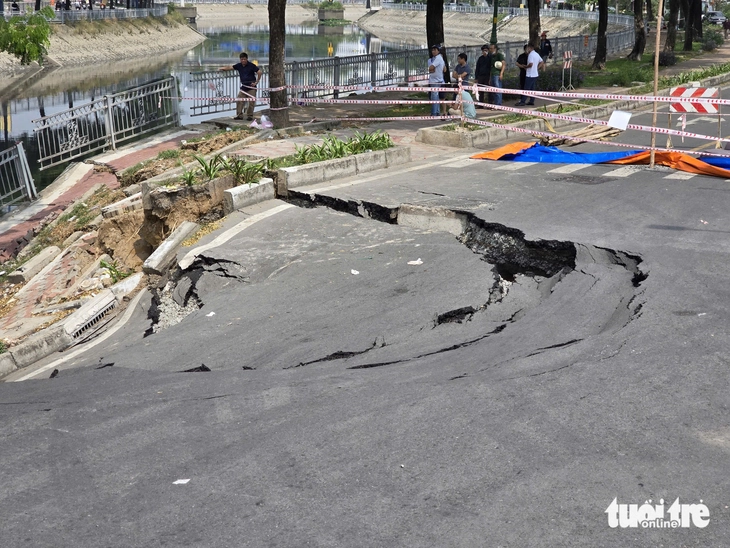 Hố sâu bị sụt lún dài khoảng 20m, rộng khoảng 10m, phần kè bờ kênh cũng bị nứt. Ghi nhận bên dưới phần sụt lún có cát, đá bị trôi xuống kênh.