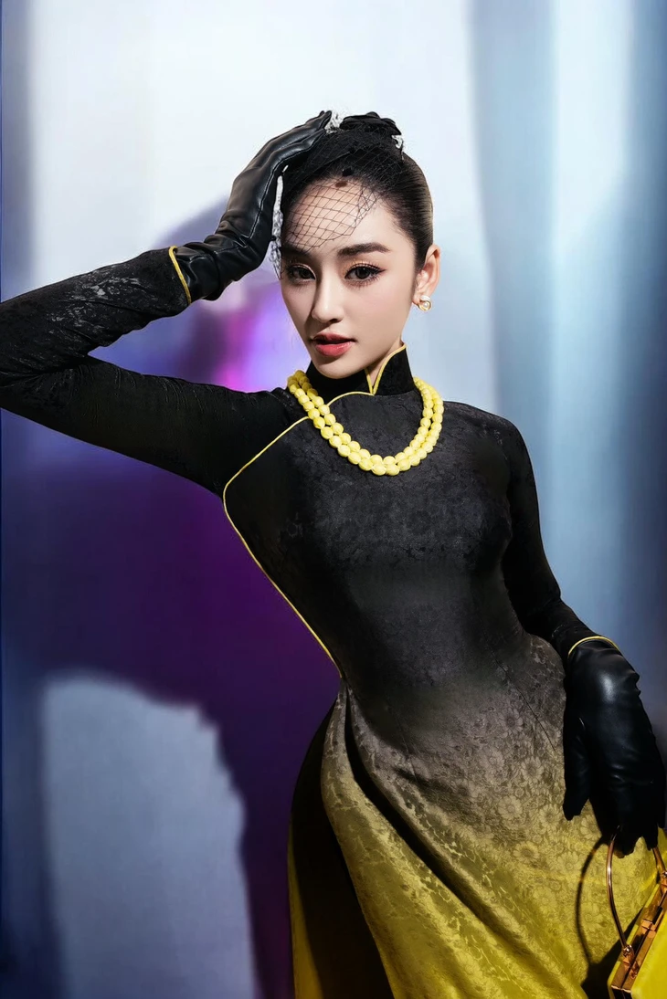 Hoa hậu Yến Nhi diện áo dài kết hợp găng tay da của nhà thiết kế Trung Đinh - Ảnh: NTK cung cấp