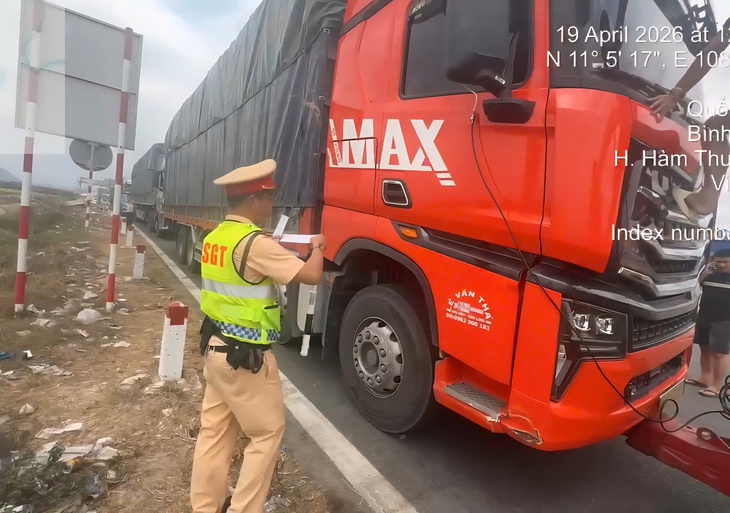 Ngày 20-4, đại diện Đội tuần tra kiểm soát giao thông đường bộ cao tốc số 6 (Đội 6) Phòng 6 Cục Cảnh sát giao thông (Bộ Công an) cho biết trước đó ngày 19-4, trong quá trình tăng cường tuần tra, kiểm soát nhằm kéo giảm tai nạn giao thông trên tuyến cao tốc Phan Thiết - Vĩnh Hảo, Đội 6 đã phát hiện và xử lý một trường hợp vi phạm nghiêm trọng liên quan đến xe tải chở hàng quá khổ, thiếu giấy tờ và tài xế không đủ điều kiện theo quy định.