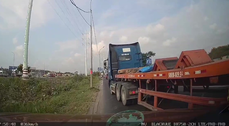 Theo clip camera hành trình xe bán tải ghi lại, thời điểm trên, xe đầu kéo đang chạy phía sau xe bán tải thì bất ngờ tăng tốc, vượt lên. Lúc này tài xế xe đầu kéo đánh lái qua trái, "ép" làn xe bán tải đang chạy.