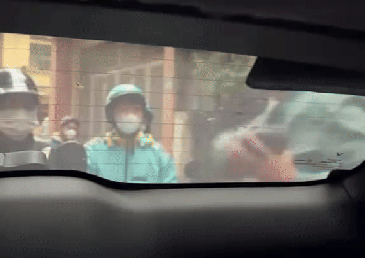 Đoạn clip người dân quay lại cho thấy tài xế ô tô vừa bước xuống xe đã lao tới đánh, đấm vào mặt và đầu người đi xe máy. Lúc này, nam tài xế xe máy đang chở một cô gái phía sau.