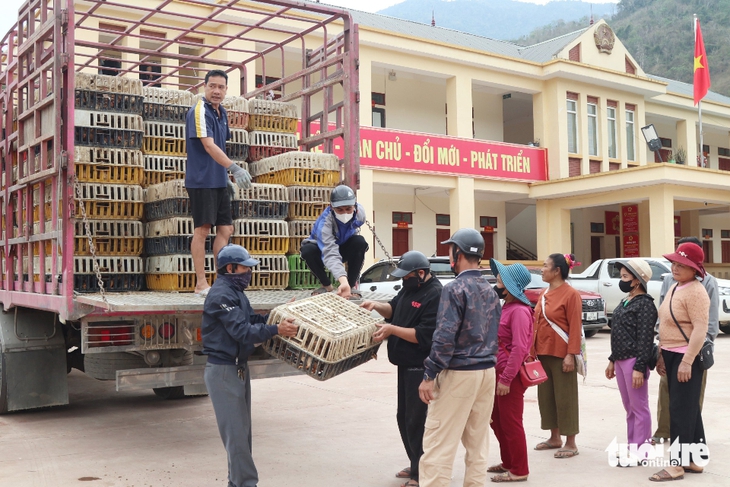 Chương trình hỗ trợ cho bà con Mỹ Lý 7.500 con gà giống, 240 bao cám, 30kg thuốc thú y; tổng giá trị nguồn lực hỗ trợ hơn 455 triệu đồng - Ảnh: DOÃN HÒA