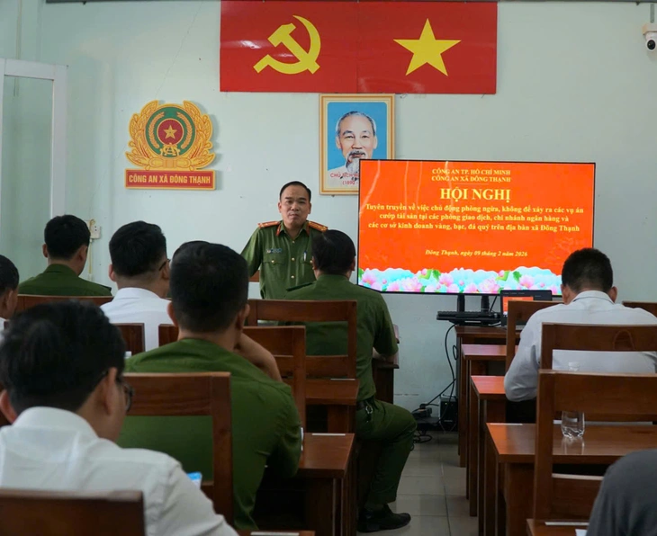 Chiều 9-2, Công an xã Đông Thạnh phối hợp Phòng Cảnh sát hình sự Công an TP.HCM tổ chức hội nghị tuyên truyền về việc phòng ngừa, không để xảy ra các vụ cướp tài sản tại các phòng giao dịch, chi nhánh ngân hàng và các cơ sở kinh doanh vàng, bạc, đá quý trên địa bàn xã Đông Thạnh.