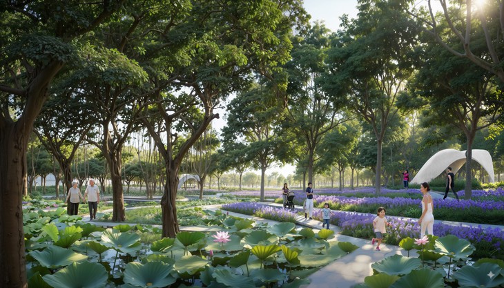 Bao quanh các tòa tháp là hệ cảnh quan sinh thái của đảo Nam với Công viên Onsen, công viên ven sông và đập sinh thái, tựa như không gian trị liệu, một vùng "vi khí hậu" trong lành, xanh mát giữa lòng Nha Trang - những tiện ích mà các đô thị lớn như Hà Nội hay TP.HCM phải "thèm muốn".