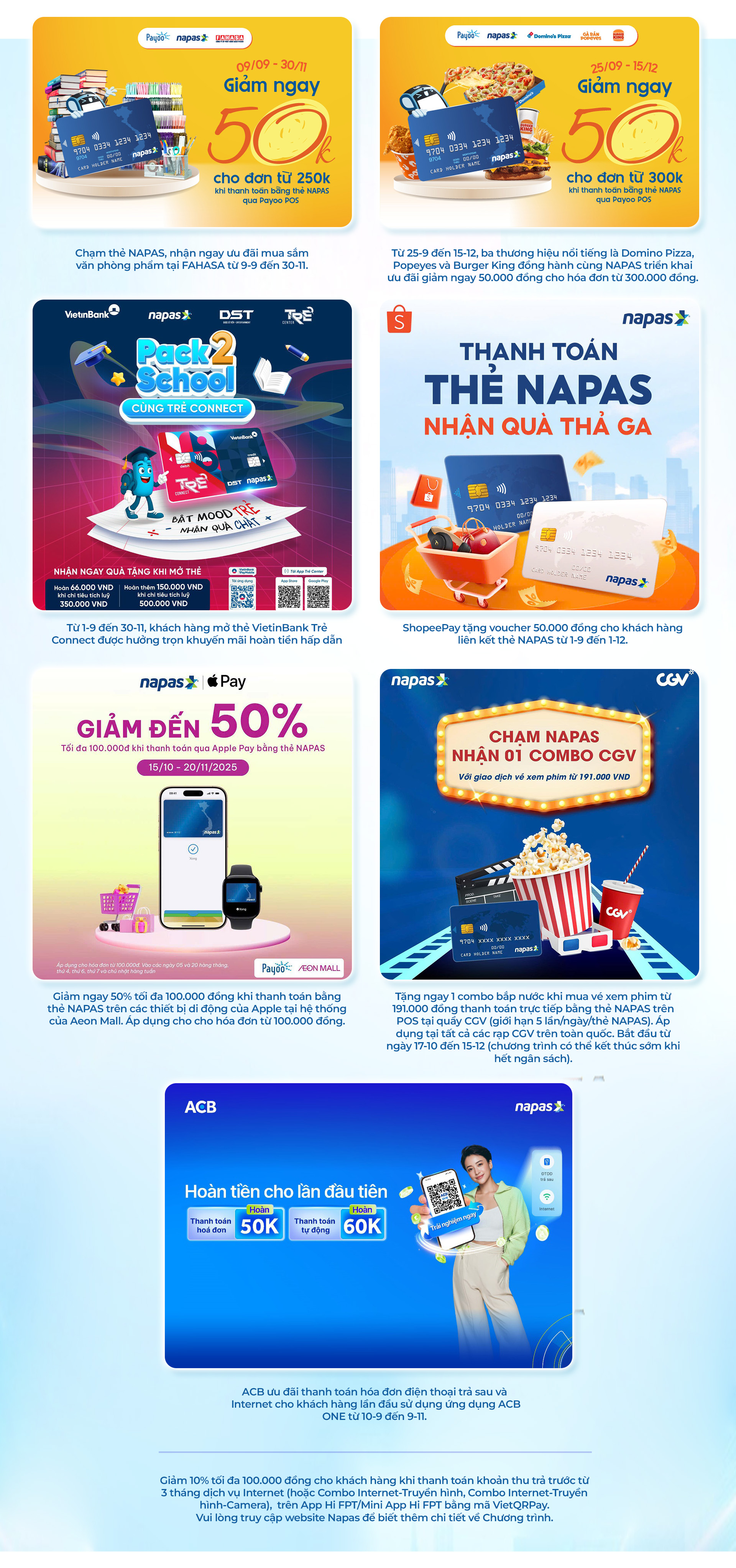 Không chỉ có vậy, NAPAS còn phối hợp với nhiều ngân hàng và thương hiệu lớn tung ra hàng loạt chương trình ưu đãi nhằm tri ân khách hàng, khuyến khích và lan tỏa những tiện ích thanh toán số.