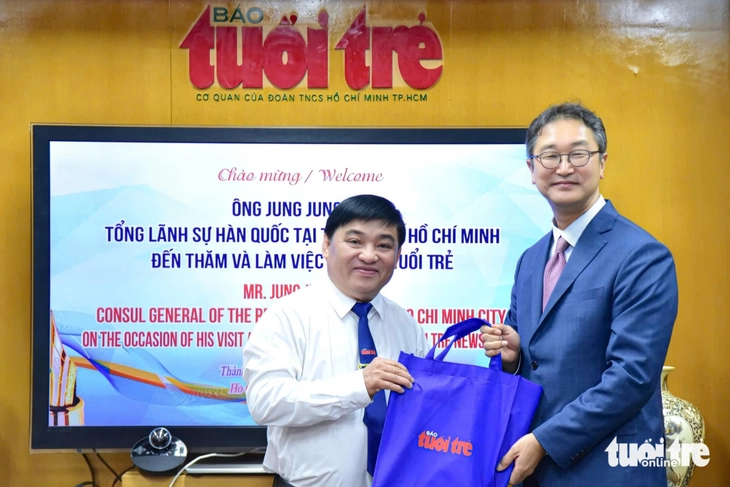 Tại buổi tiếp chiều 24-3, ông Jung Jung Tae cùng Tổng biên tập báo Tuổi Trẻ Lê Thế Chữ đã trao đổi về những ưu tiên trong việc góp phần tăng cường quan hệ Việt Nam - Hàn Quốc, cũng như mối quan hệ giữa báo Tuổi Trẻ và Tổng lãnh sự quán Hàn Quốc tại TP.HCM.