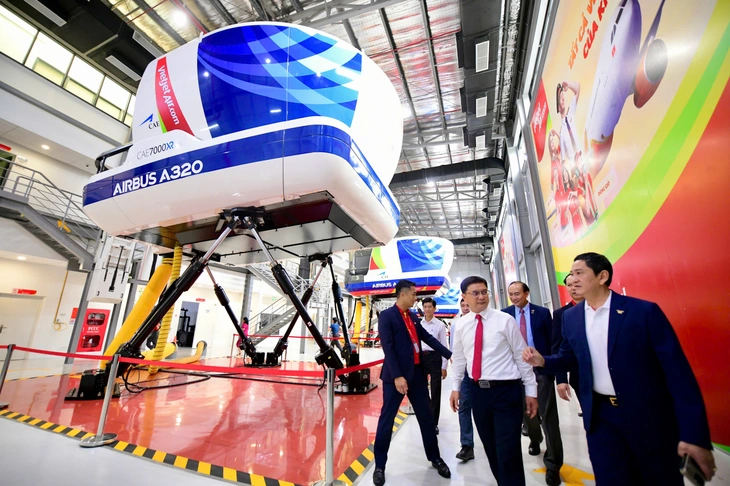 Ông Nguyễn Mạnh Cường, Phó chủ tịch UBND TP.HCM (thứ hai từ phải sang), tham quan Học viện Hàng không Vietjet trong buổi thăm, chúc tết chiều 26-2 - Ảnh: QUANG ĐỊNH