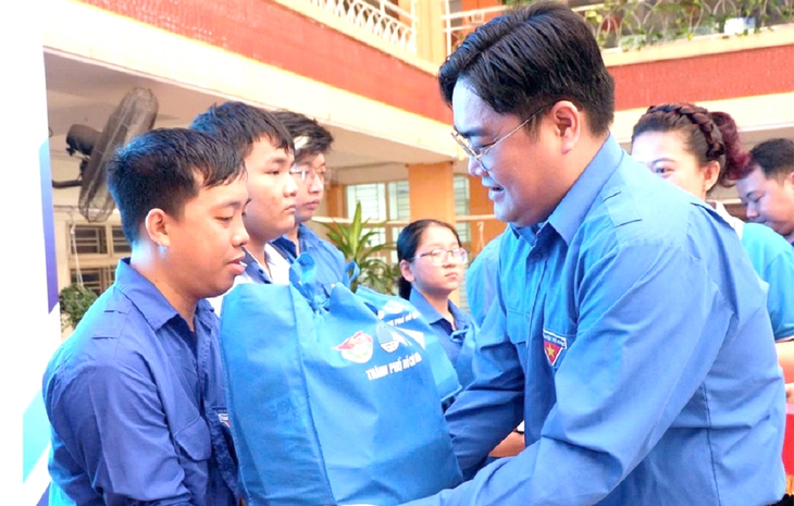 Bí thư Thành Đoàn TP.HCM Ngô Minh Hải (phải) trao quà cho các bạn trẻ khó khăn phường Chợ Lớn (TP.HCM) trong Tháng thanh niên 2026 - Ảnh: K.ANH