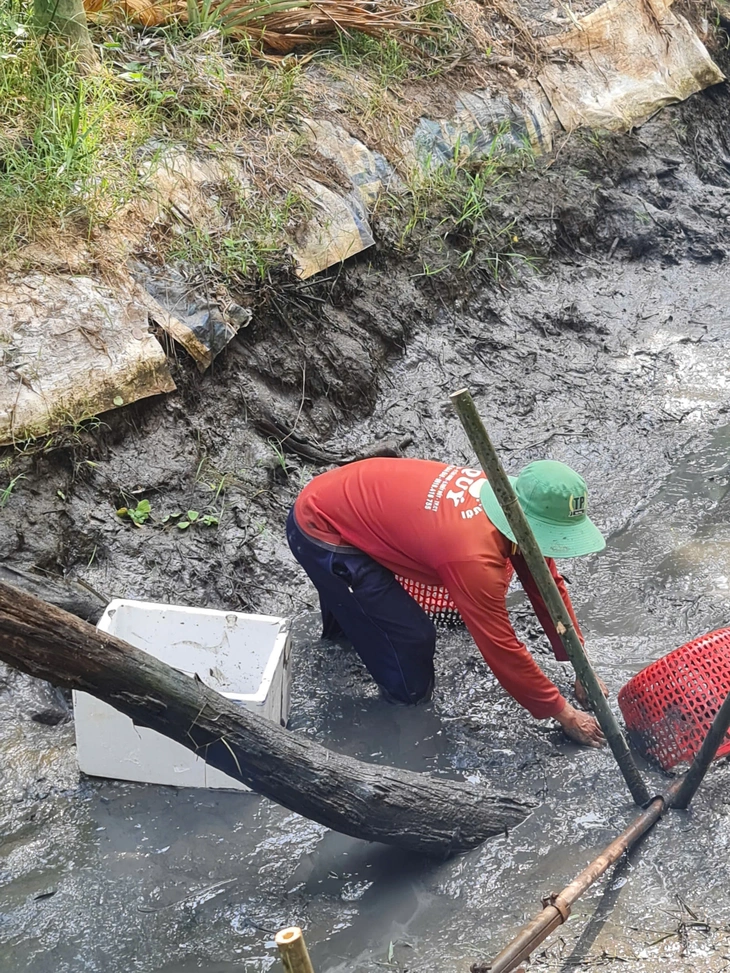 Một anh nông dân xuống mò cá. Đạo diễn Đỗ Khuê của mục Cần Thơ Phố cũng hứng thú lội xuống mương sình. Mương lún sâu quá, nên không ai trong nhóm nối bước anh. Chỉ có mỗi anh bạn Quân, người Pháp gốc Việt, lội xuống đầu mương, chỗ ít lún để đem thùng mốp hứng cá do Khuê và một anh chàng nông dân quăng cho. Gọi là để check-in vài kiểu ảnh.