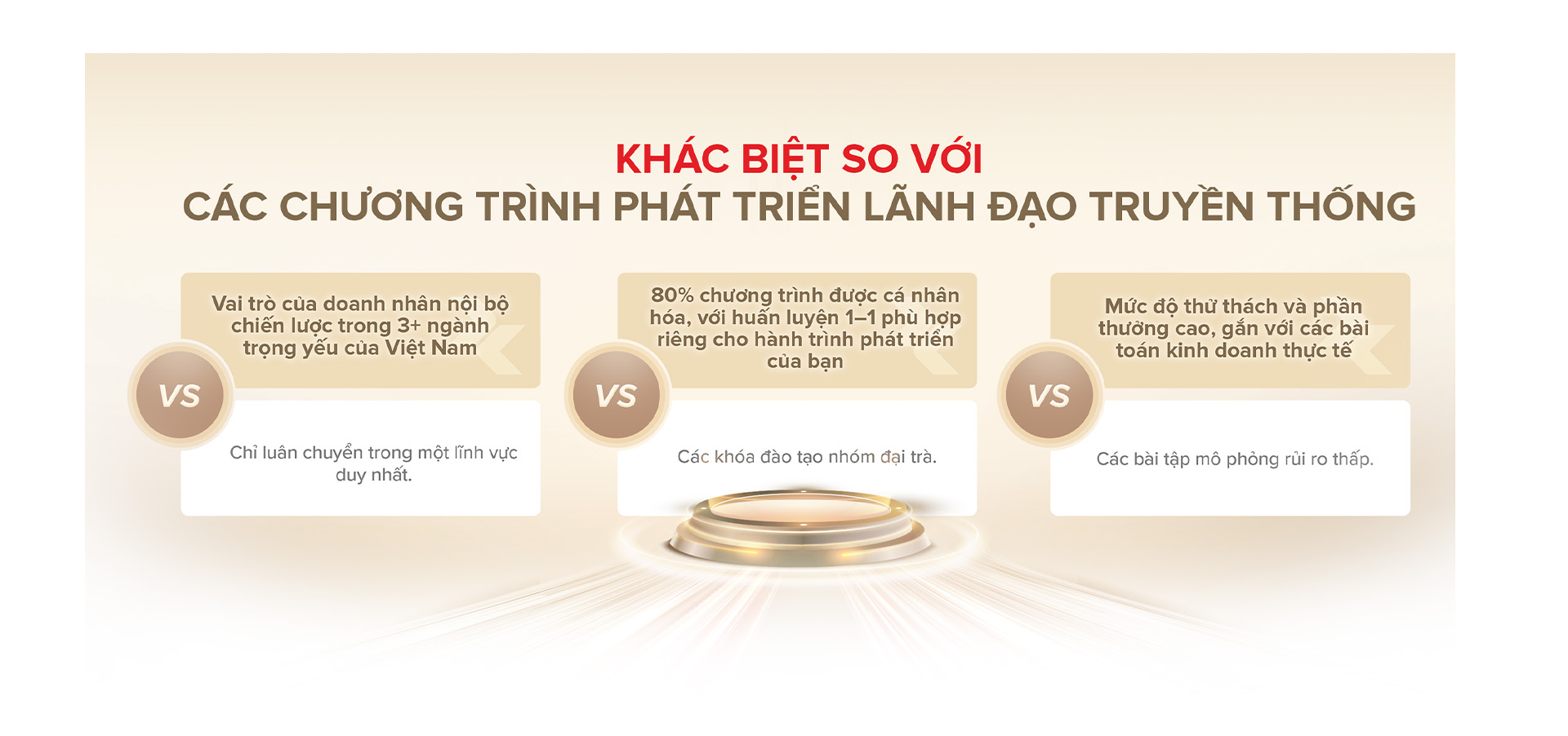 Khoảng 70 đến 80% trải nghiệm của mỗi thành viên được thiết kế theo hình thức "đo ni đóng giày", cá nhân hóa dựa trên năng lực, mục tiêu và hành trình phát triển sự nghiệp riêng. Họ sẽ không chỉ được đào tạo qua các khóa học bài bản, mà còn nhận được sự đồng hành và làm việc trực tiếp cùng đội ngũ lãnh đạo cấp cao theo cơ chế ưu tiên (Priority Access) – những người trực tiếp chỉ đạo, định hướng và cùng họ thực hiện các dự án. Đây là đặc quyền hiếm có, cho phép nhân tài không chỉ học hỏi từ các xu hướng quản trị tiên tiến, mà còn được thử thách qua thực tiễn kinh doanh đa ngành tại Việt Nam, từ tài chính – ngân hàng, bất động sản đến công nghệ với những người đứng đầu. Trải nghiệm đó sẽ giúp họ hình thành tư duy lãnh đạo toàn diện, bản lĩnh kiến tạo đổi mới bền vững và năng lực dẫn dắt ở quy mô hệ sinh thái.