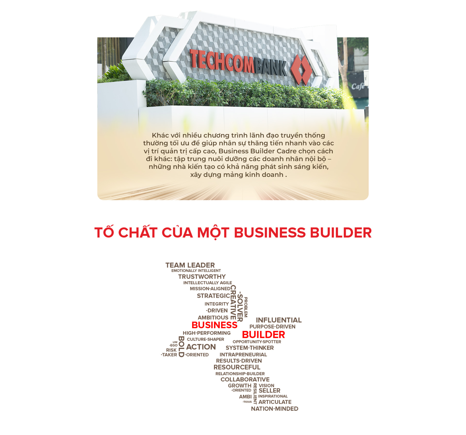 Nhân sự được lựa chọn vào Business Builder Cadre là những người trong top 25% nhân tài hàng đầu của Techcombank và hệ sinh thái, sở hữu kinh nghiệm vượt trội, năng lực học thuật hoặc thành tích chuyên môn, có tư duy phân tích sắc bén và tố chất lãnh đạo. Theo đó, Business Builder Cadre không đơn thuần là một chương trình phát triển nhân sự mà được định vị như một nền tảng chiến lược nhằm kiến tạo "hệ sinh thái lãnh đạo" – nơi các cá nhân xuất sắc được ươm mầm để trở thành những người dẫn dắt, đóng góp trực tiếp vào sự phát triển bền vững của toàn bộ hệ sinh thái và xa hơn là kinh tế Việt Nam trong kỷ nguyên mới.