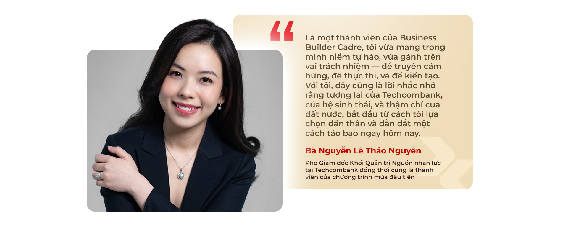 Bà Nguyễn Lê Thảo Nguyên - một lãnh đạo cấp cao của Techcombank, đồng thời cũng là thành viên của chương trình mùa đầu tiên, chia sẻ: "Là một thành viên của Business Builder Cadre, tôi vừa mang trong mình niềm tự hào, vừa gánh trên vai trách nhiệm — để truyền cảm hứng, để thực thi, và để kiến tạo. Với tôi, đây cũng là lời nhắc nhở rằng tương lai của Techcombank, của hệ sinh thái, và thậm chí của đất nước, bắt đầu từ cách tôi lựa chọn dấn thân và dẫn dắt một cách táo bạo ngay hôm nay."