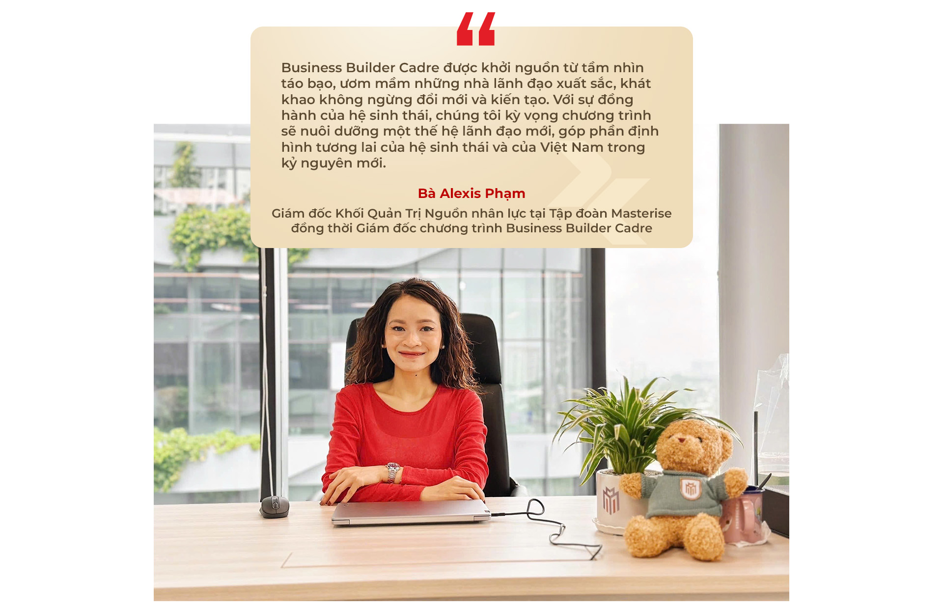 Bà Alexis Phạm, CHRO, Tập đoàn Masterise, đồng thời là giám đốc chương trình, chia sẻ: "Business Builder Cadre được khởi nguồn từ tầm nhìn táo bạo, ươm mầm những nhà lãnh đạo xuất sắc, khát khao không ngừng đổi mới và kiến tạo. Với sự đồng hành của hệ sinh thái, chúng tôi kỳ vọng chương trình sẽ nuôi dưỡng một thế hệ lãnh đạo mới, góp phần định hình tương lai của hệ sinh thái và của Việt Nam trong kỷ nguyên mới."