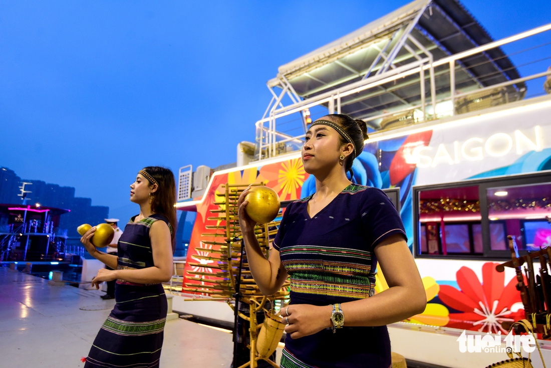 Du khách thưởng thức tiết mục đàn T'rưng, cồng chiêng giữa không gian sông nước Sài Gòn