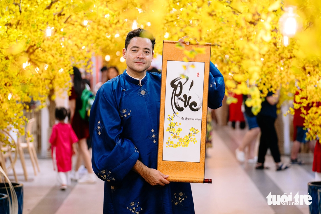 Trong sắc vàng, câu đối đỏ và tiếng nhạc xuân rộn ràng tại Lễ hội Tết Việt - Nhà văn hóa Thanh niên TP.HCM (phường Sài Gòn) chiều 11-2, hình ảnh Tổng lãnh sự Pháp diện áo dài truyền thống dạo quanh thu hút sự chú ý của nhiều người tham dự lễ hội.