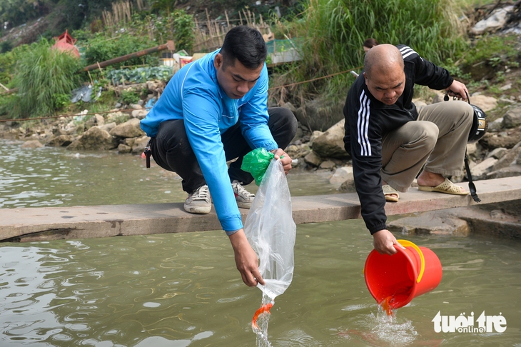 Theo ghi nhận của Tuổi Trẻ Online, trưa 10-2 (23 tháng chạp) có rất đông người dân tới các khu vực ven bờ sông Hồng, hồ Tây (Hà Nội) để thả cá chép.