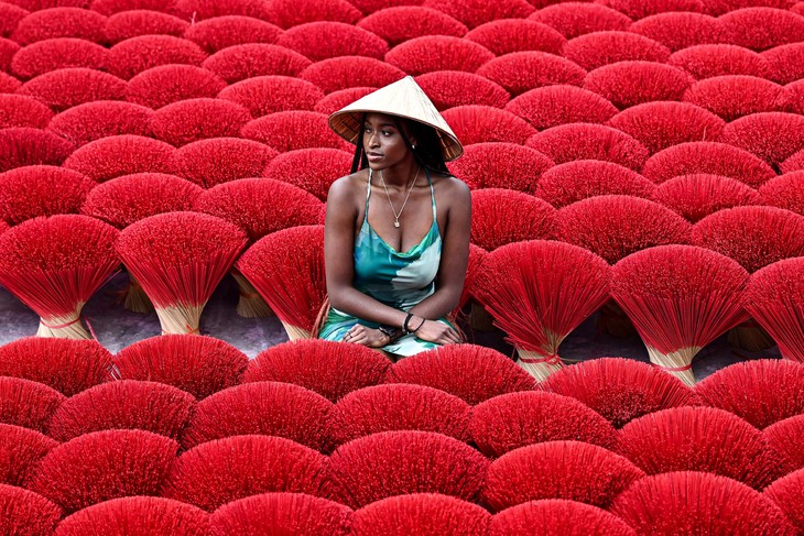 Du khách nước ngoài tạo dáng tại làng hương Quảng Phú Cầu, ngoại ô Hà Nội, ngày 20-1-2024 - Ảnh: AFP