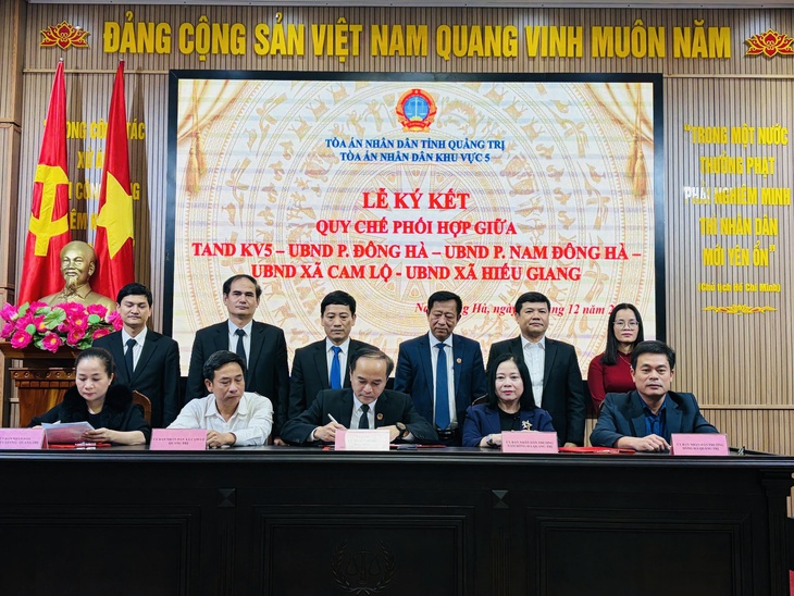 Tòa án nhân dân khu vực 5 - Quảng Trị ký kết quy chế phối hợp với 4 xã, phường trong khu vực phụ trách - Ảnh: QUANG HÀ
