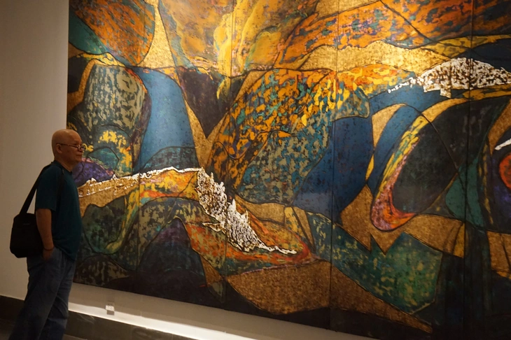 Đáng chú ý, tác phẩm Hết ngày thứ nhất gây ấn tượng với kích thước lớn nhất, lên tới 220 x 720cm, gồm 6 tấm ghép, cũng là tác phẩm bắt mắt nhất tại triển lãm với bảng màu phong phú, rực rỡ.