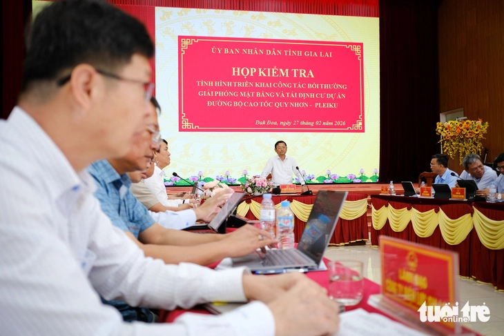 Lãnh đạo UBND tỉnh Gia Lai đôn đốc các xã phường giải phóng mặt bằng dự án đường cao tốc Quy Nhơn - Pleiku tại cuộc họp ngày 27-2 - Ảnh: TẤN LỰC